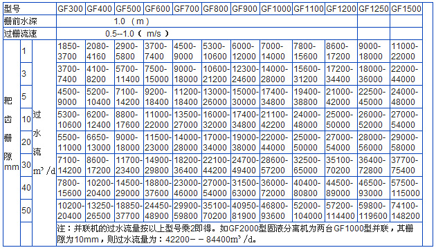 設備規格按機寬尺寸分HF300-3600型。機寬超過1800mm,則做成并聯機。耙齒柵隙分為1mm、3mm、5mm、10mm、20mm、30mm、40mm、50mm等各種規格,選型由過水量、提升高度、固液分離總量和所分離物質的形狀、顆粒大小來選擇,同時選配不同的材質。